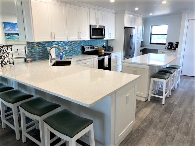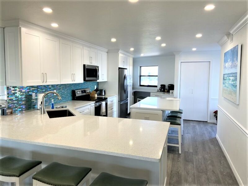 Direct Beachfront Condo overlooking tropical courtyard and 90 ft Main lap/swimming pool. Your view of the evening "sunset" will be spectacular from the 2 comfortable reclining chairs facing out to the Gulf. The Master Bedroom has a King Bed while the Guest Bedroom has a Queen Bed. Completely remodeled kitchen and bathrooms with elevated ceilings throughout the main area with quartz countertops lend a spacious atmosphere. New 65 inch HDTV with sound bar in the living room. The living room with new carpet has been extended to include the lanai with the window sliding open to include the tropical breezes. Full washer and dryer. This unit is truly a rare beachfront gem.