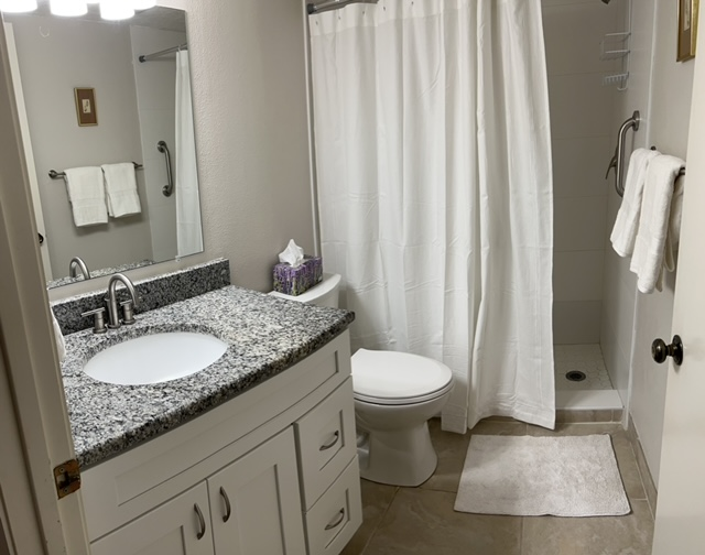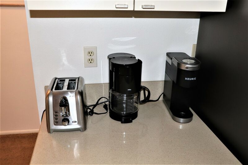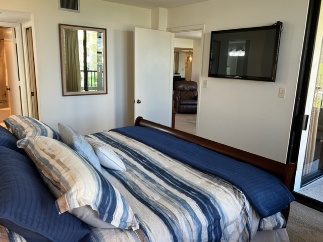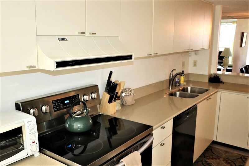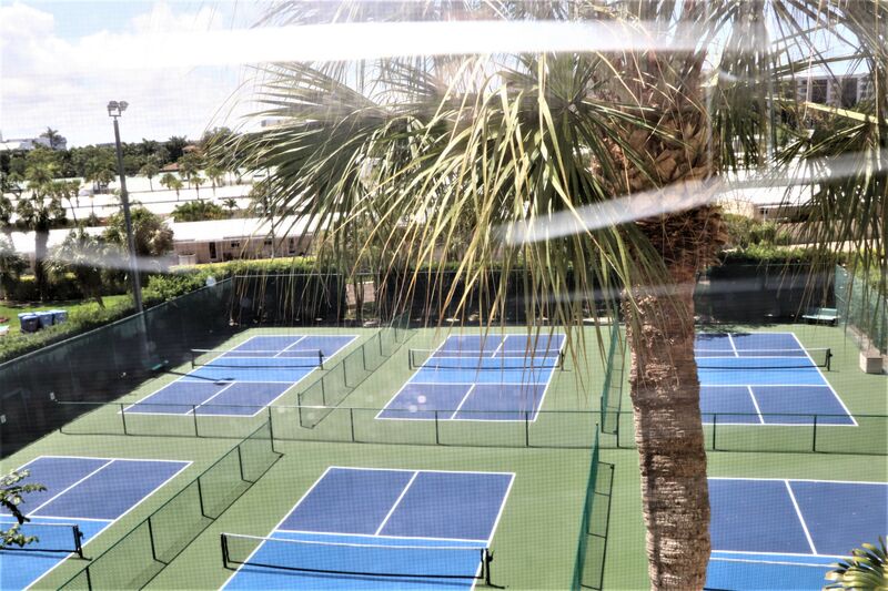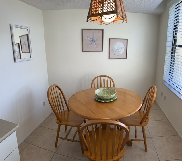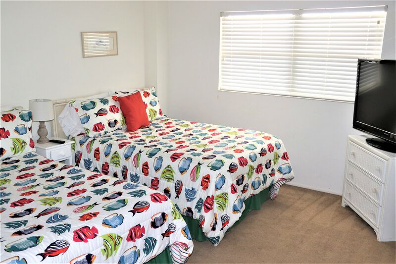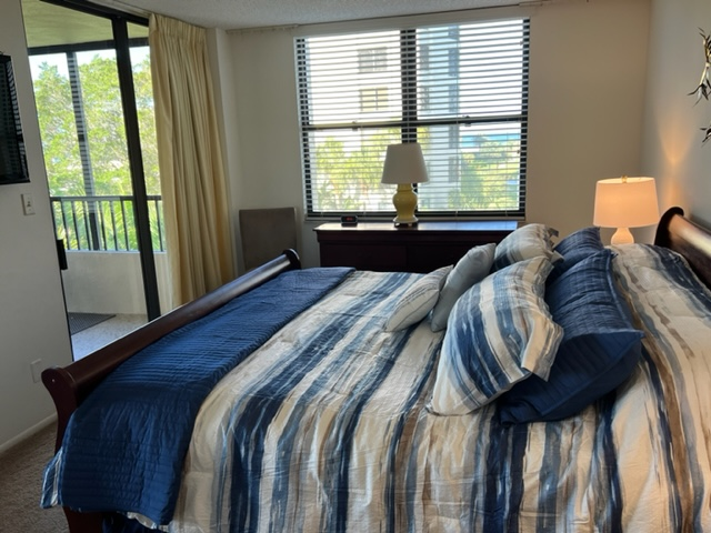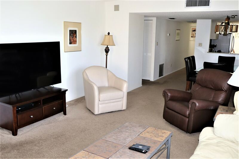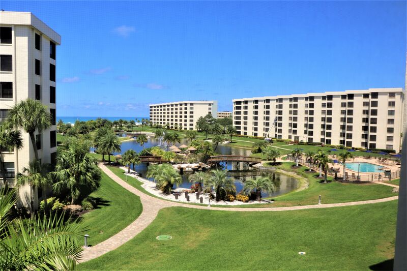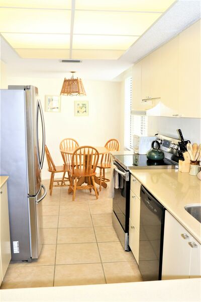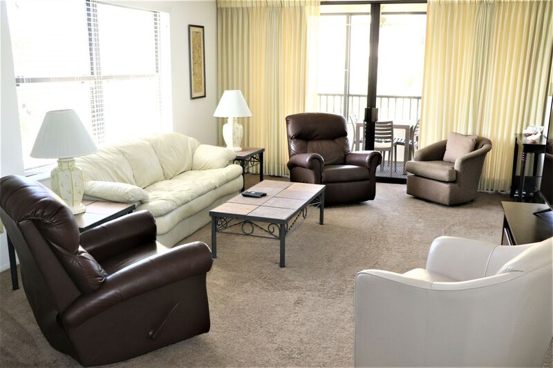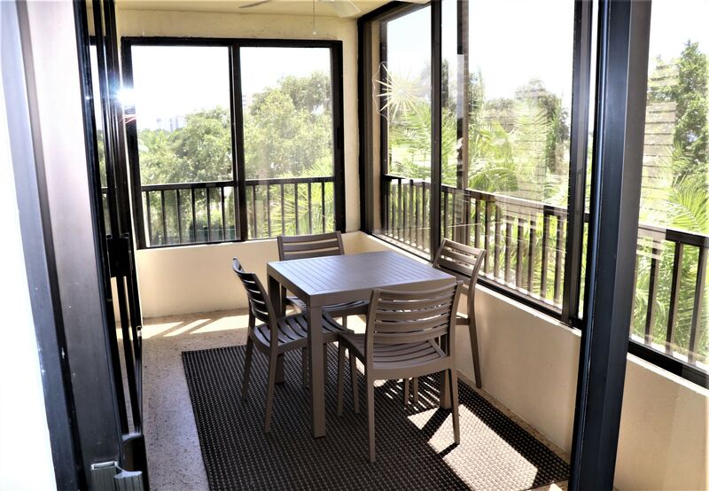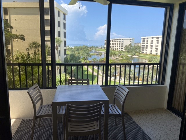 Bright corner unit on the 4th floor of C Bldg. The living room is furnished with a sofa, two recliners and two easy chairs. A large window above the sofa provides abundant light throughout the condo. The lanai includes comfortable seating for 4-5 people with full view of the impressive sunsets and the beautifully landscaped courtyard with the lake and fountains, tiki huts, pools and mature palm trees. Sliders on the lanai can be opened for access to fresh gulf breezes. Flat screen TV's are in the living room and both bedrooms with the master TV wall-mounted to catch up on programs while relaxing in the king size bed. The sunny kitchen has granite counter tops and a breakfast nook which seats four and overlooks the tennis courts. Both bathrooms have been upgraded with granite countertops and raised vanities and commodes. The guest bathroom has a walk-in shower. Original artwork adorns the walls of the condo and there is newer carpeting throughout.