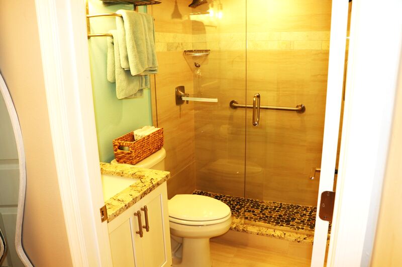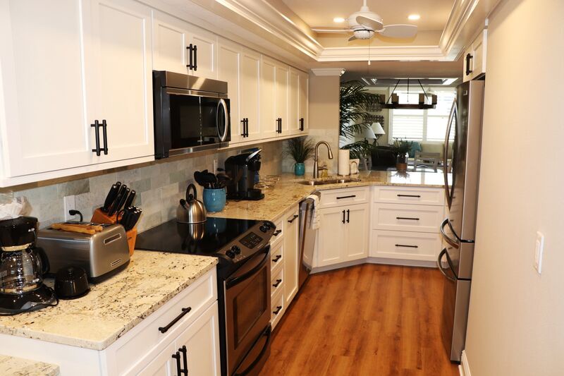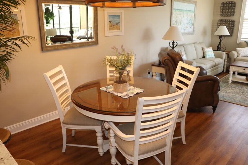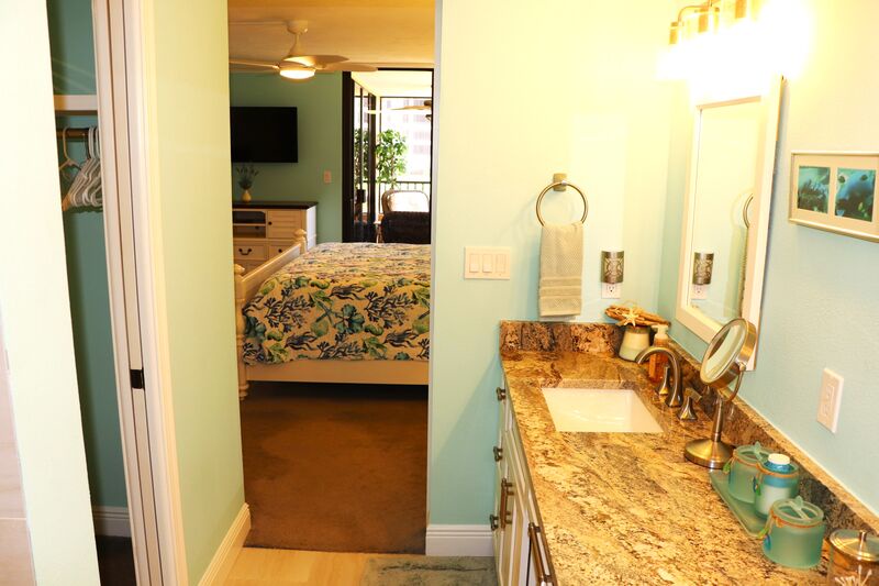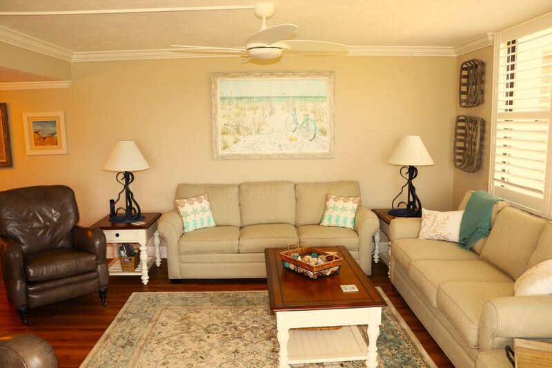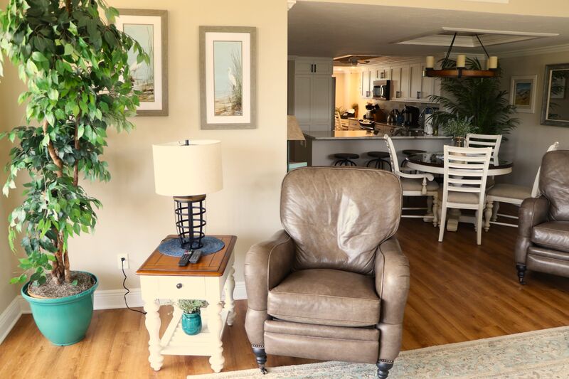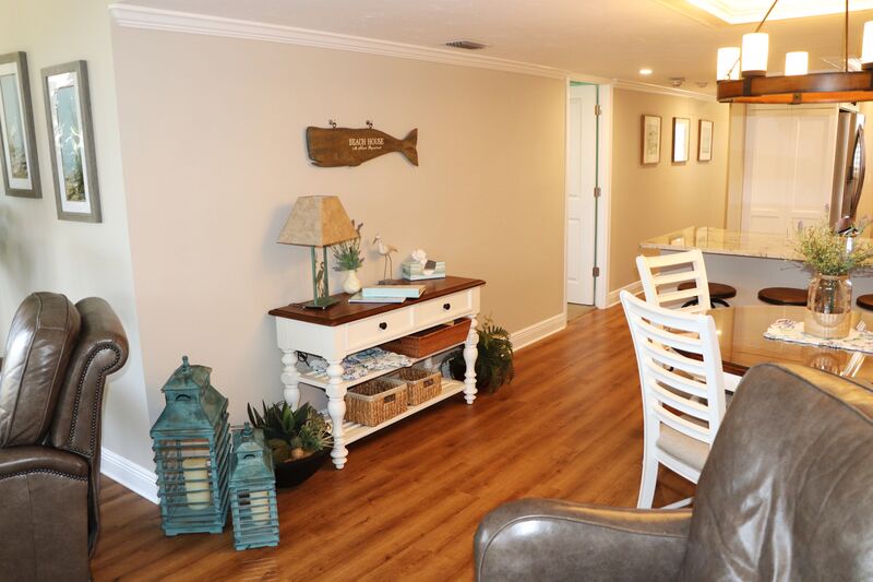 Kitchen has new granite countertops, a breakfast bar, updated appliances including a microwave, Keurig, and everything you will need to cook and entertain. The dining room seats 6 and the living room has 2 couches (one with a queen sleeper) for plenty of seating. Large screen TV, blue-ray, and a beautiful view! Lanai has comfortable seating for relaxing in the Coastal Lifestyle. There is a desk area in kitchen for catching up on emails using the high-speed wireless internet.
