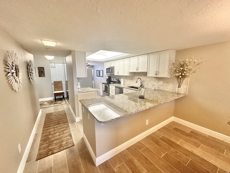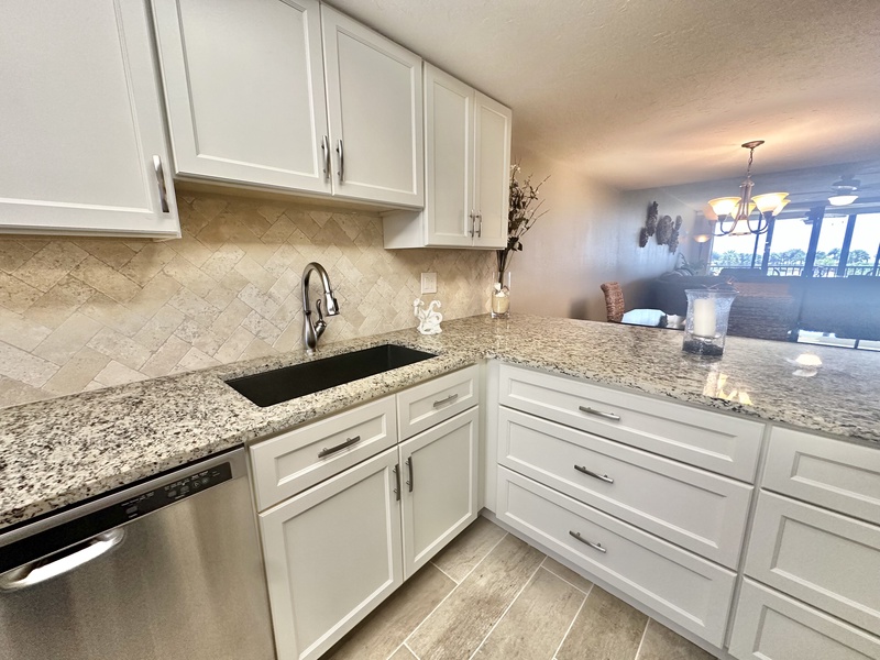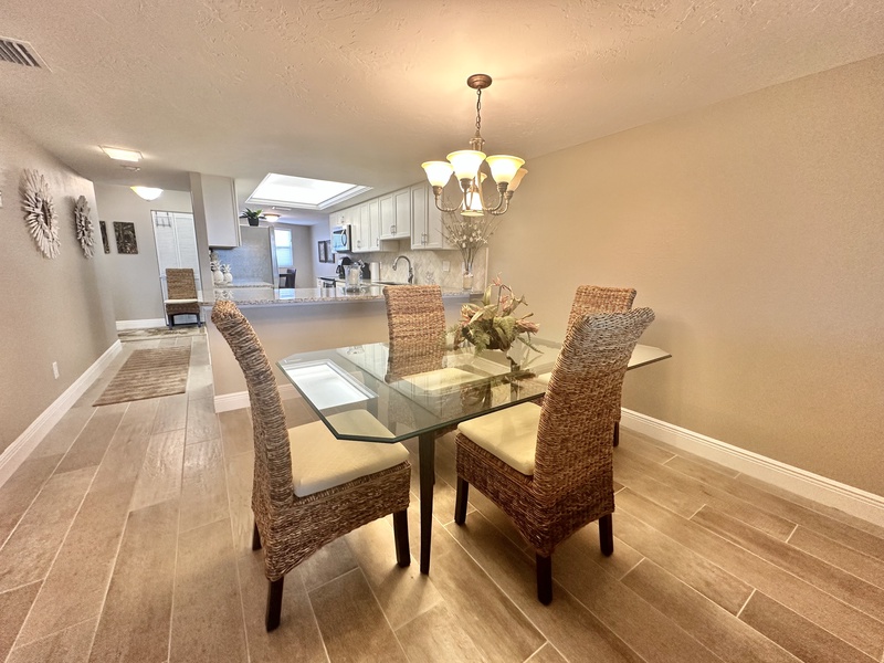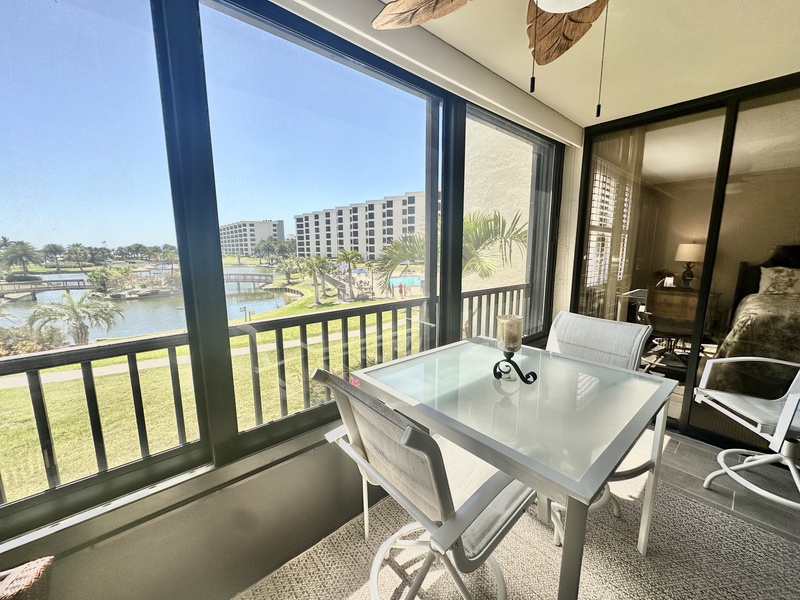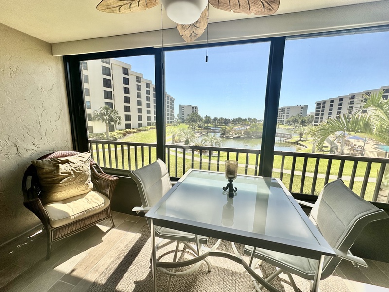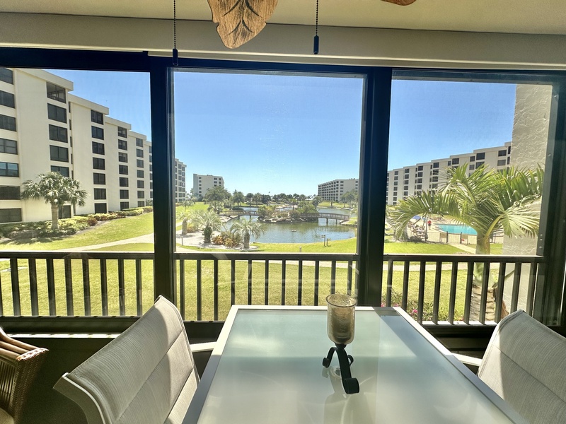 Welcome to Gulf and Bay Club C204! This beautiful two bedroom and two bath condo features a screened-in lanai with a dining table overlooking the condominiums lake, community pool, and you might just catch a glimpse of the Gulf of Mexico. Inside is a gorgeous, fully equipped kitchen, complete with all the necessary cookware, stainless steel appliances, a wicker and glass dining set that can accommodate four people and a large sectional couch with a TV. The main bedroom is a true oasis of comfort, featuring a king-sized bed adorned with plush bedding and tropical decor. The attached bathroom is equally impressive, boasting two vanities, a walk-in shower, and a walk-in closet. The second bedroom is charmingly decorated with Florida-style furnishings and has easy access to the hall bath, which includes a shower and tub combo. To ensure your utmost convenience, each room has a television, and a washer and dryer are readily available for use.