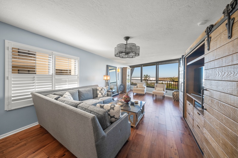 Inside the condo, unwind in the spacious living room featuring a large sectional sofa and breathtaking beach views—the perfect setting for relaxation and memorable gatherings. The fully equipped kitchen dazzles with stunning cabinets and stainless steel appliances, ideal for preparing delectable meals. Both bedrooms are well-appointed with king beds, TVs, and luxurious bedding for a restful night's sleep.
