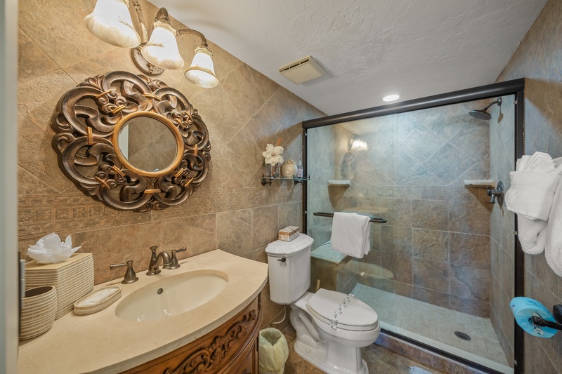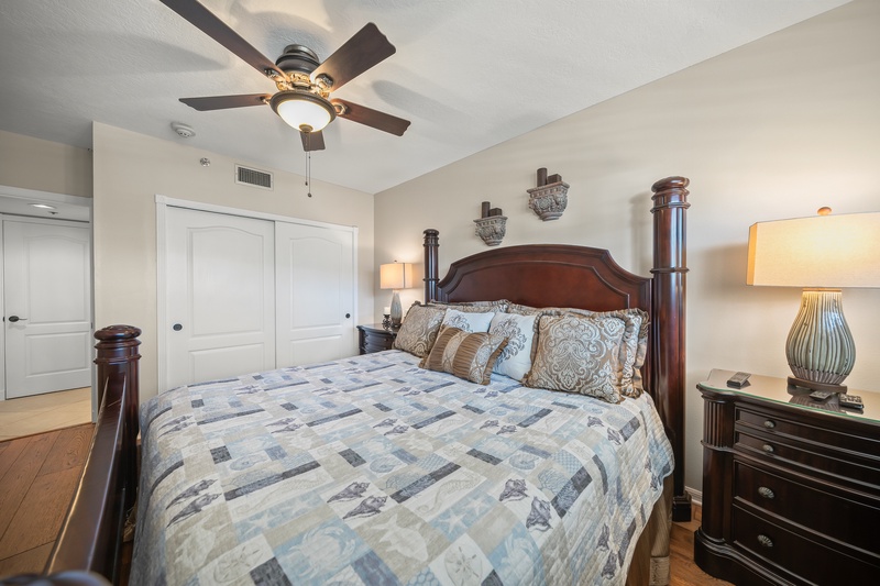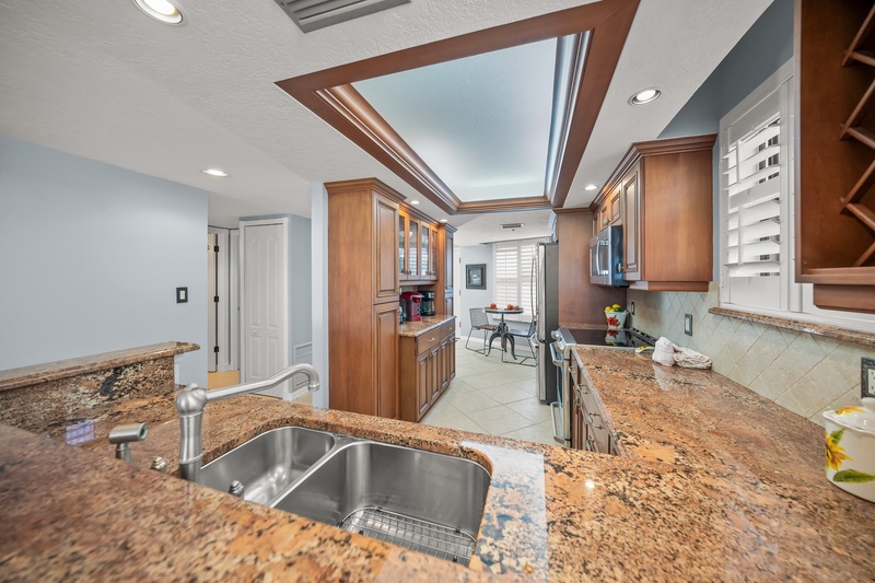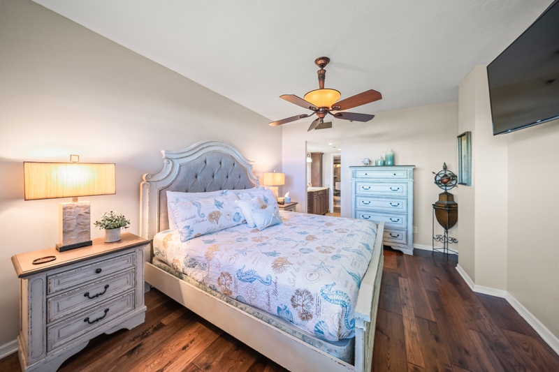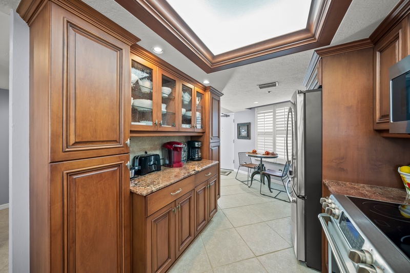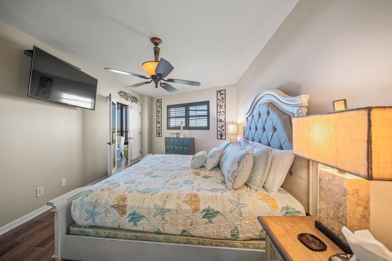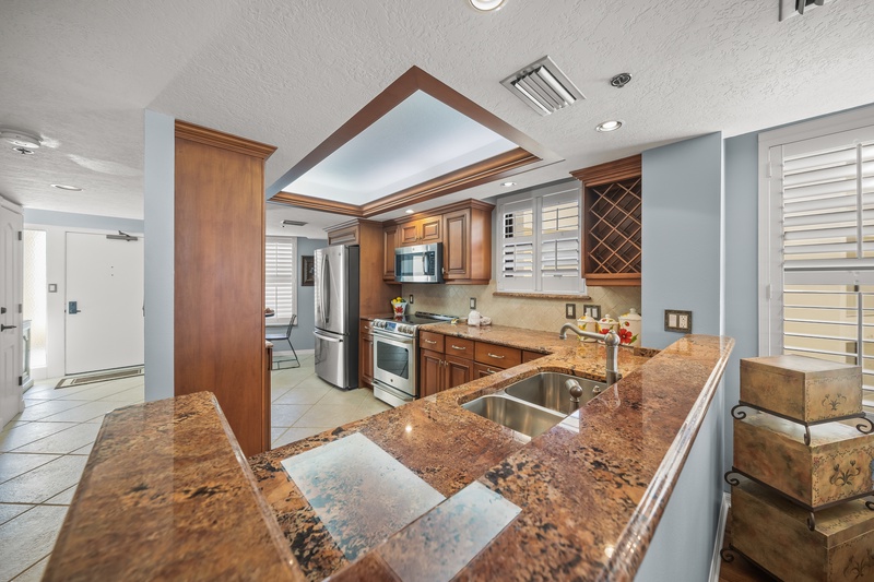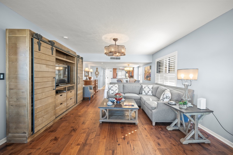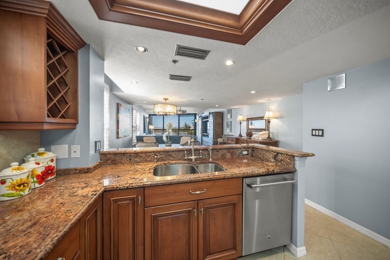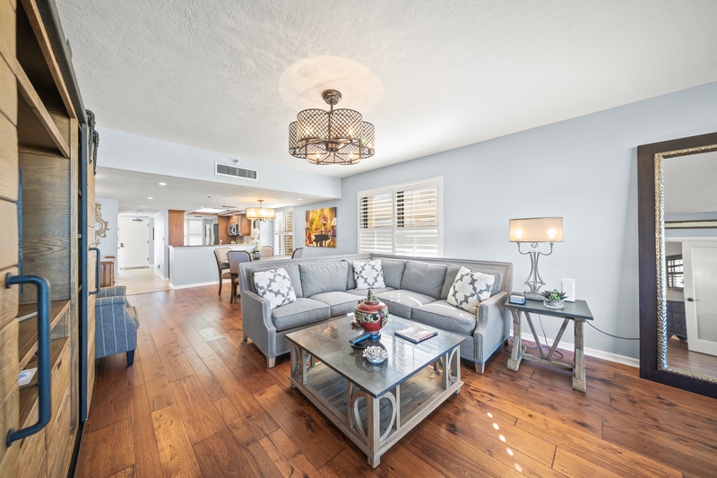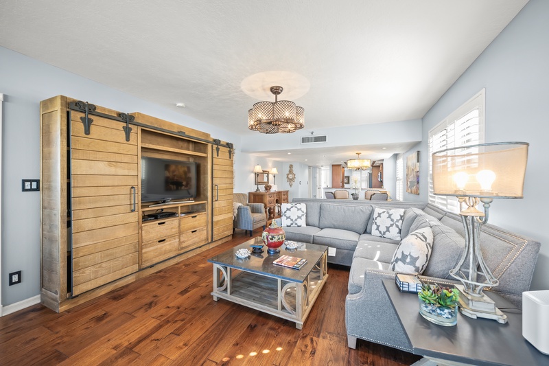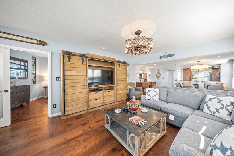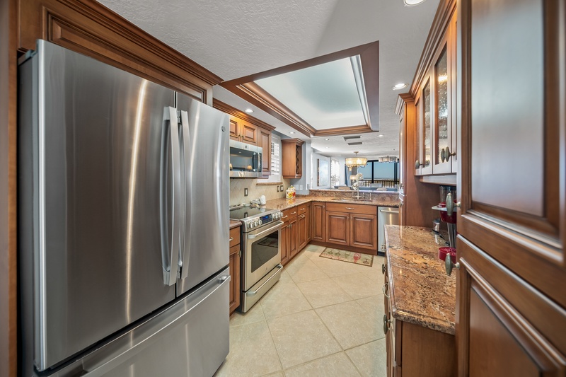 Inside the condo, unwind in the spacious living room featuring a large sectional sofa and breathtaking beach views—the perfect setting for relaxation and memorable gatherings. The fully equipped kitchen dazzles with stunning cabinets and stainless steel appliances, ideal for preparing delectable meals. Both bedrooms are well-appointed with king beds, TVs, and luxurious bedding for a restful night's sleep.