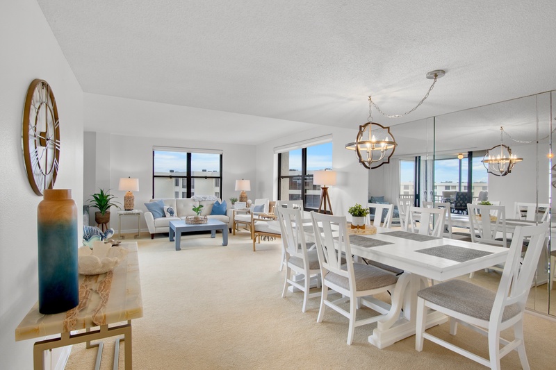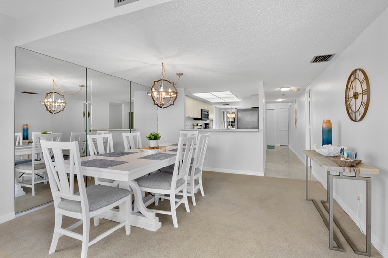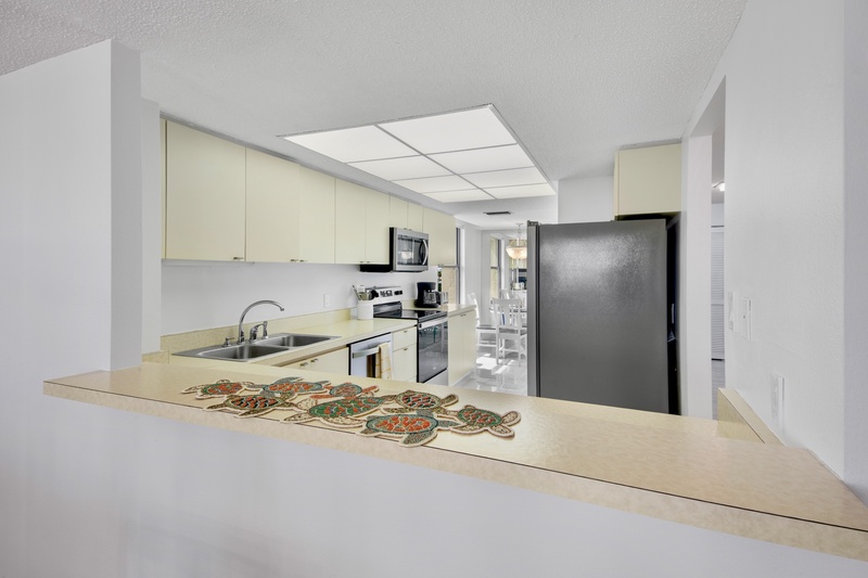 The bright and airy living room offers a cozy gathering area with plush seating, a flat-screen TV, and access to natural light, ideal for lounging after beach days. The adjacent dining area comfortably seats four and flows into a fully equipped kitchen featuring a refrigerator, stove, oven, microwave, toaster, dishwasher, and drip coffeemaker—everything you need for meal prep or leisurely morning coffee.