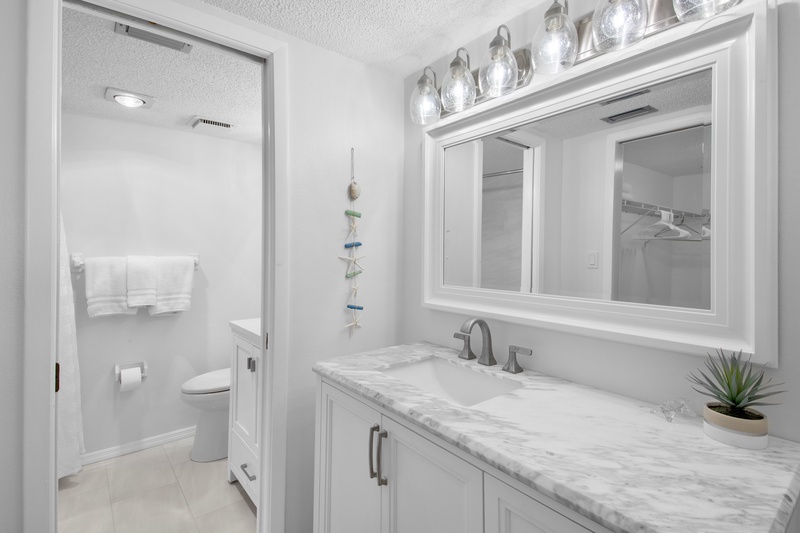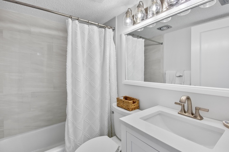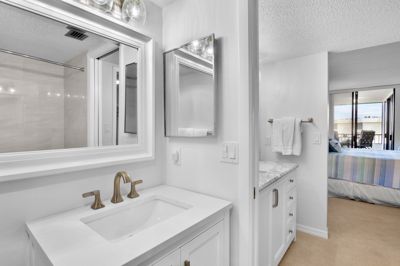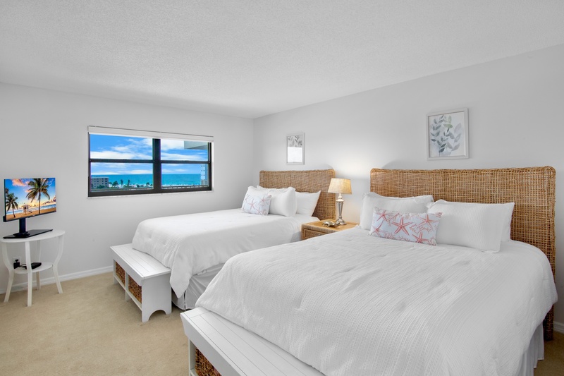 The serene primary bedroom includes a king bed, generous closet space, and an ensuite bathroom with dual vanity sinks and a walk-in shower. The second bedroom is spacious and thoughtfully furnished with two queen beds, making it ideal for families or friends traveling together. A second full bathroom is located off the hallway and includes a tub/shower combination and a single vanity sink.