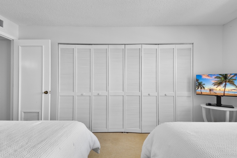 • Bedroom 2: Two queen beds, shared hallway bath with shower/tub combo