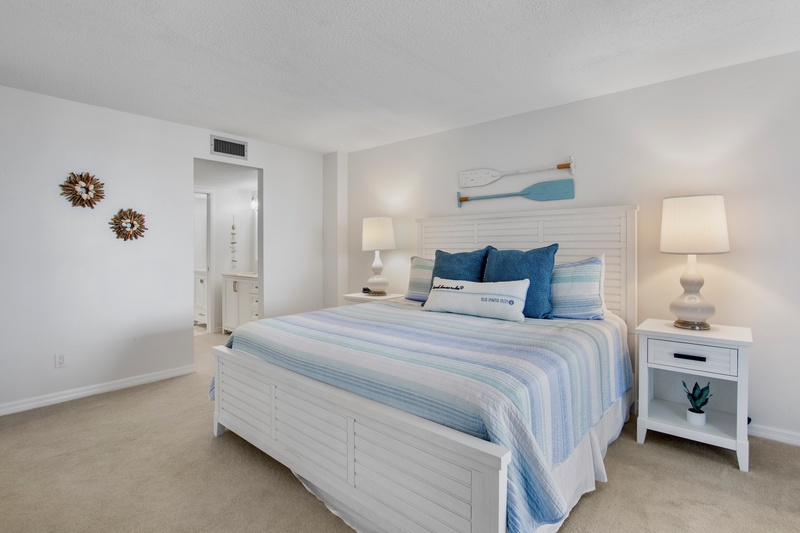 • Primary Bedroom: King bed, ensuite bathroom with dual vanities